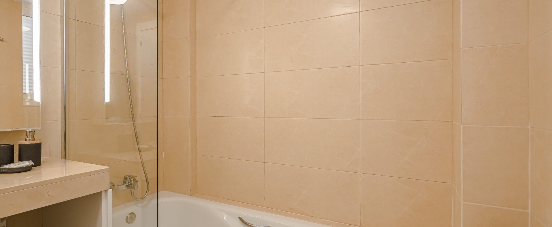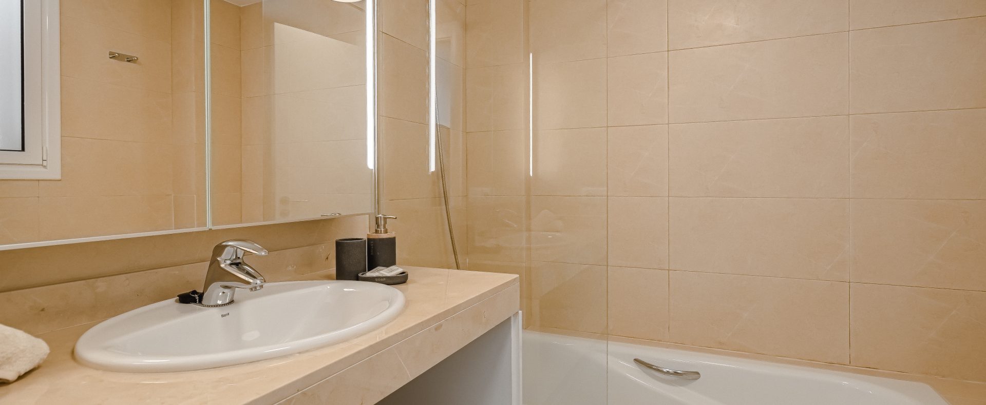 — There is 1 modern family bathroom with bath / shower that has good pressure