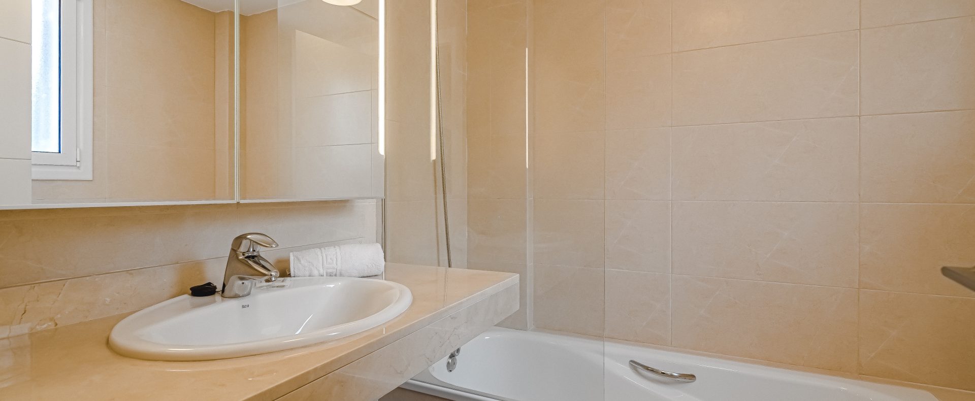 — There is 1 modern family bathroom with bath / shower that has good pressure
