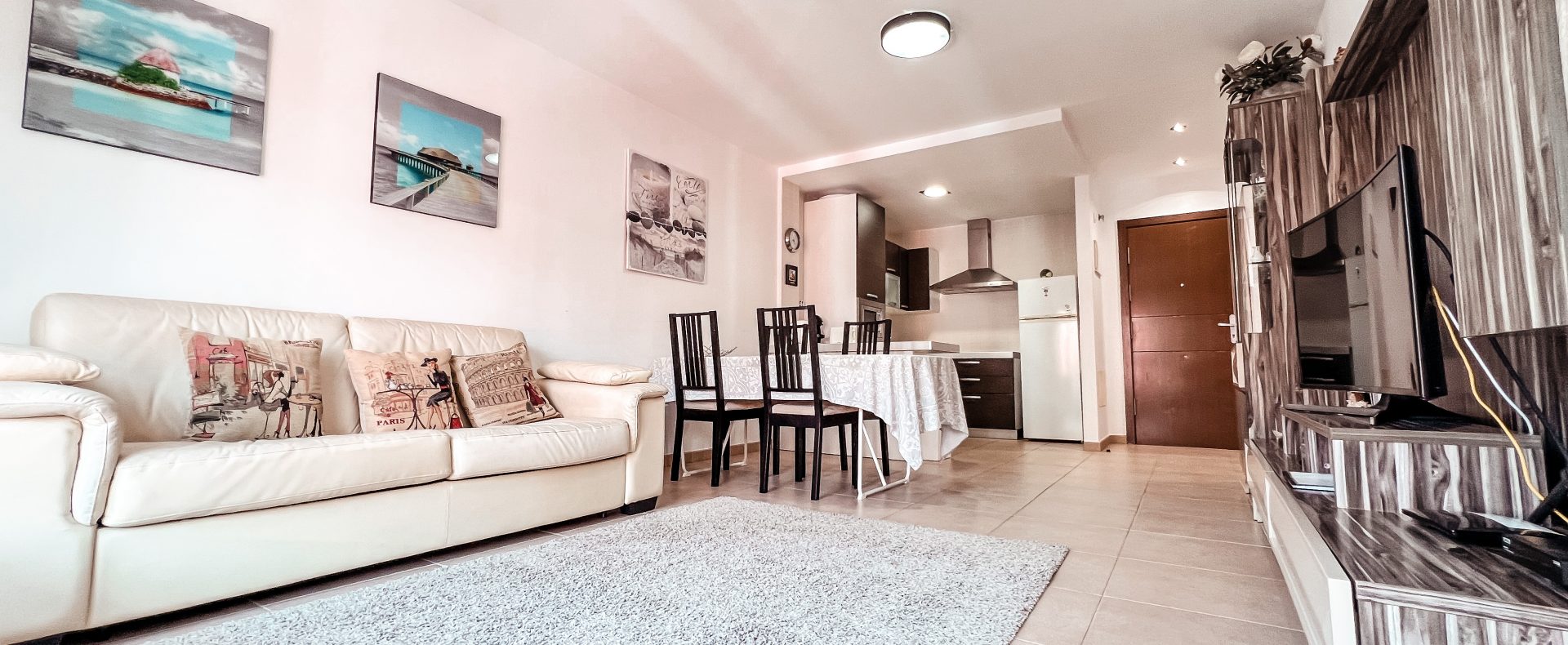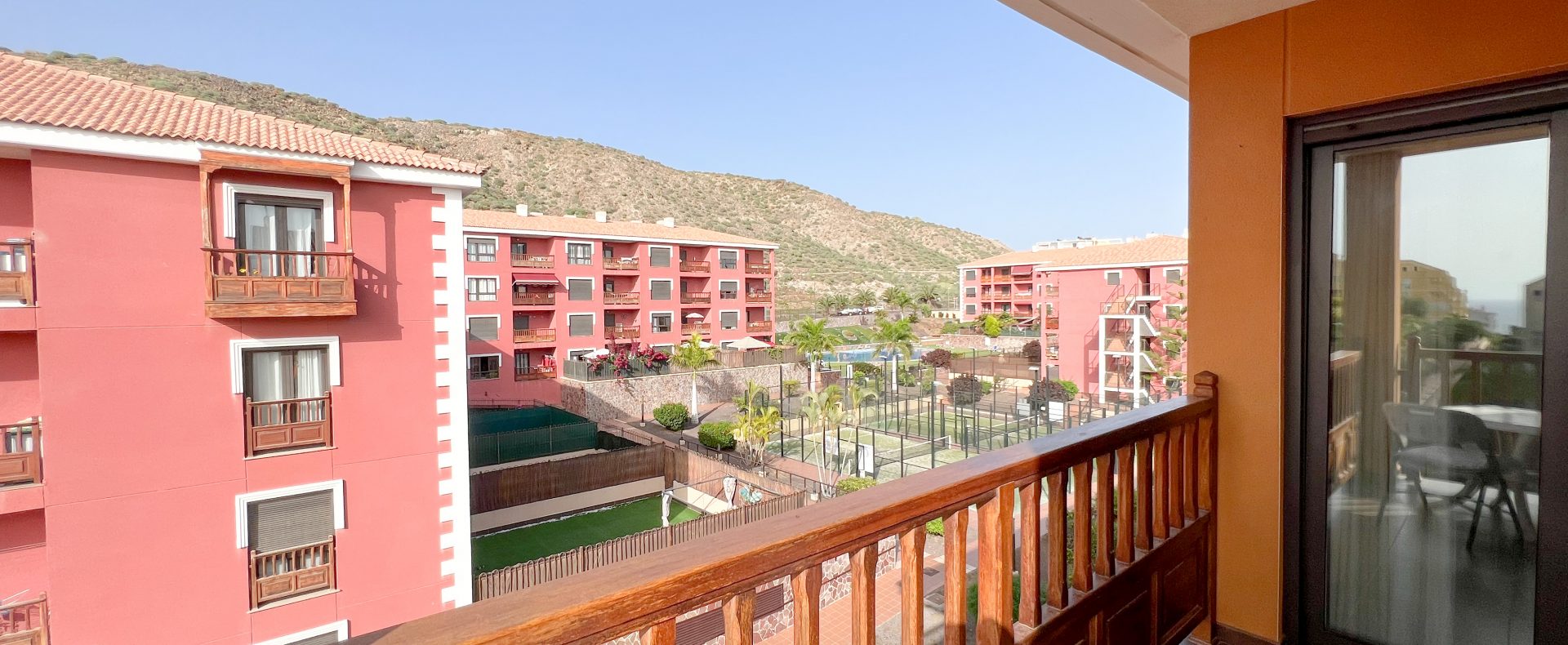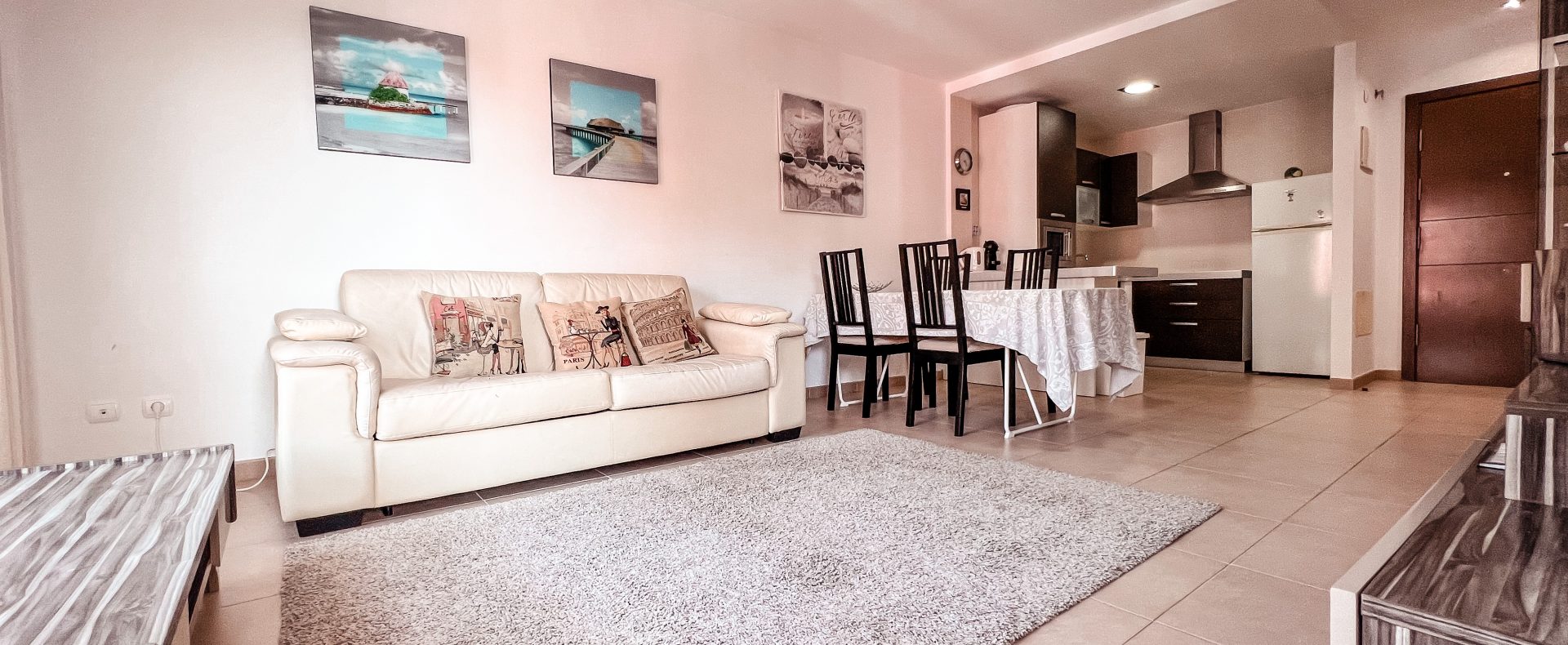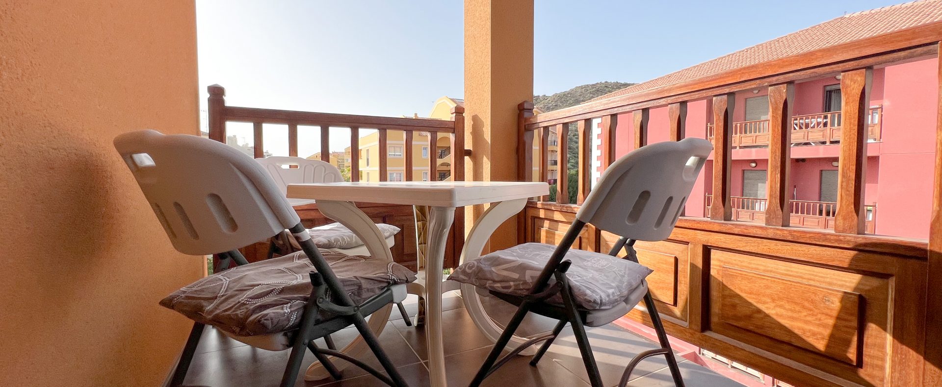 This spacious and bright apartment in residential building in Palm Mar is featuring 1 bedroom, 1 bathroom and open concept kitchen with spacious living room. Private balcony overlooks mountains and quiet street. There is a pool and padle court waiting to be used downstairs! This apartment can comfortably accommodate 4 people for great vacation in sunny Tenerife.