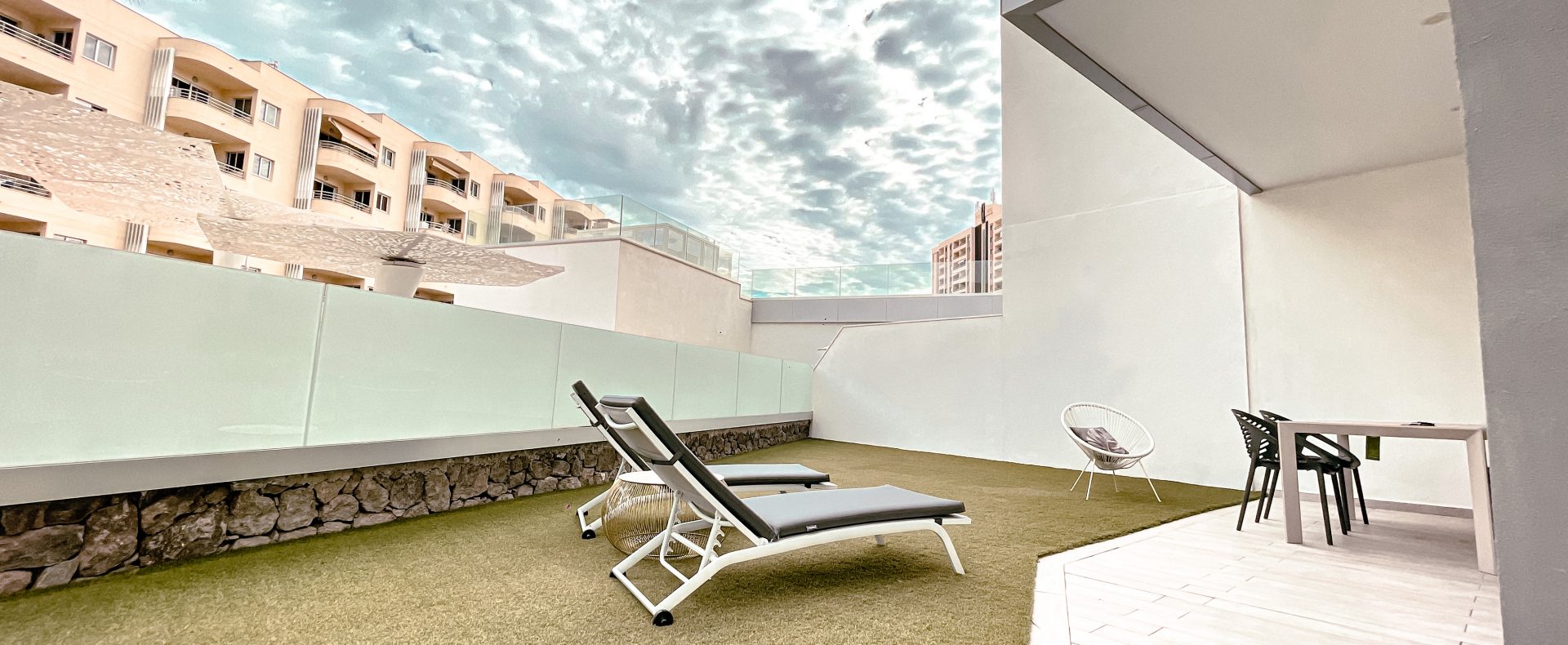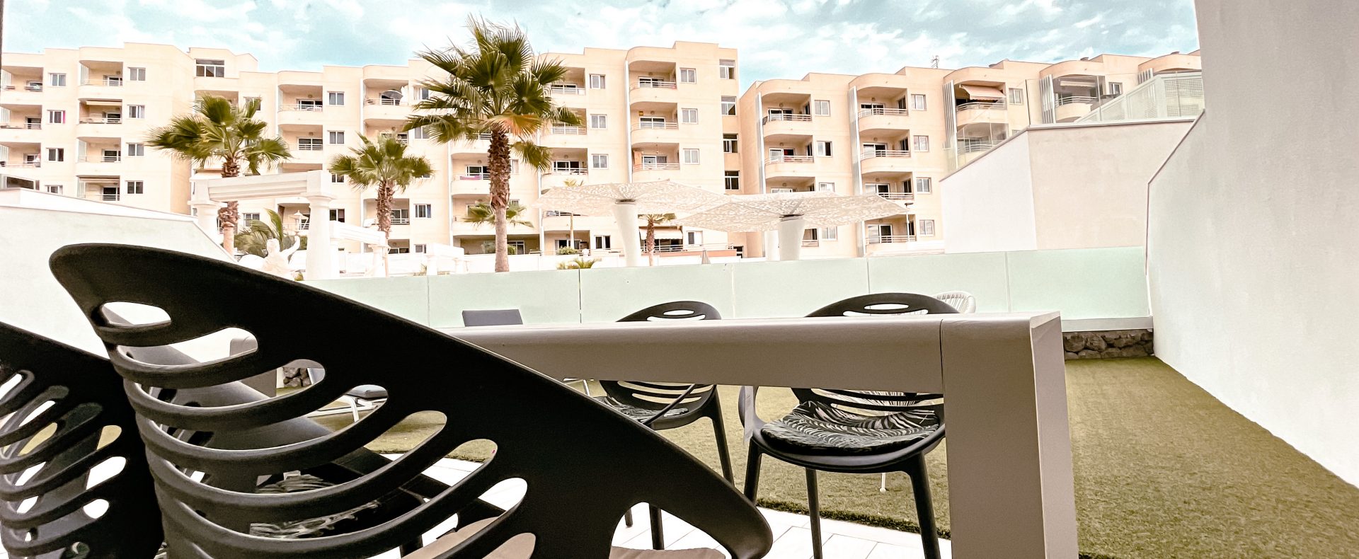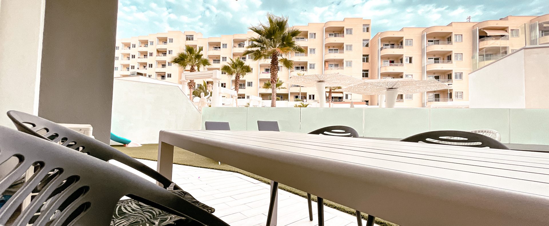 — There is a dining table and a sun bed