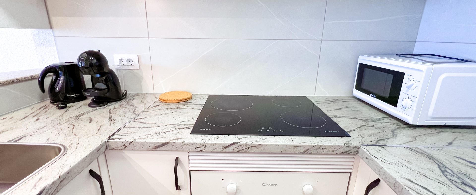 — Open concept kitchen with bar table for 2, with everything you might need to prepare and enjoy your lovely meals – pans and pots, as well cutlery, dishes and glasses
