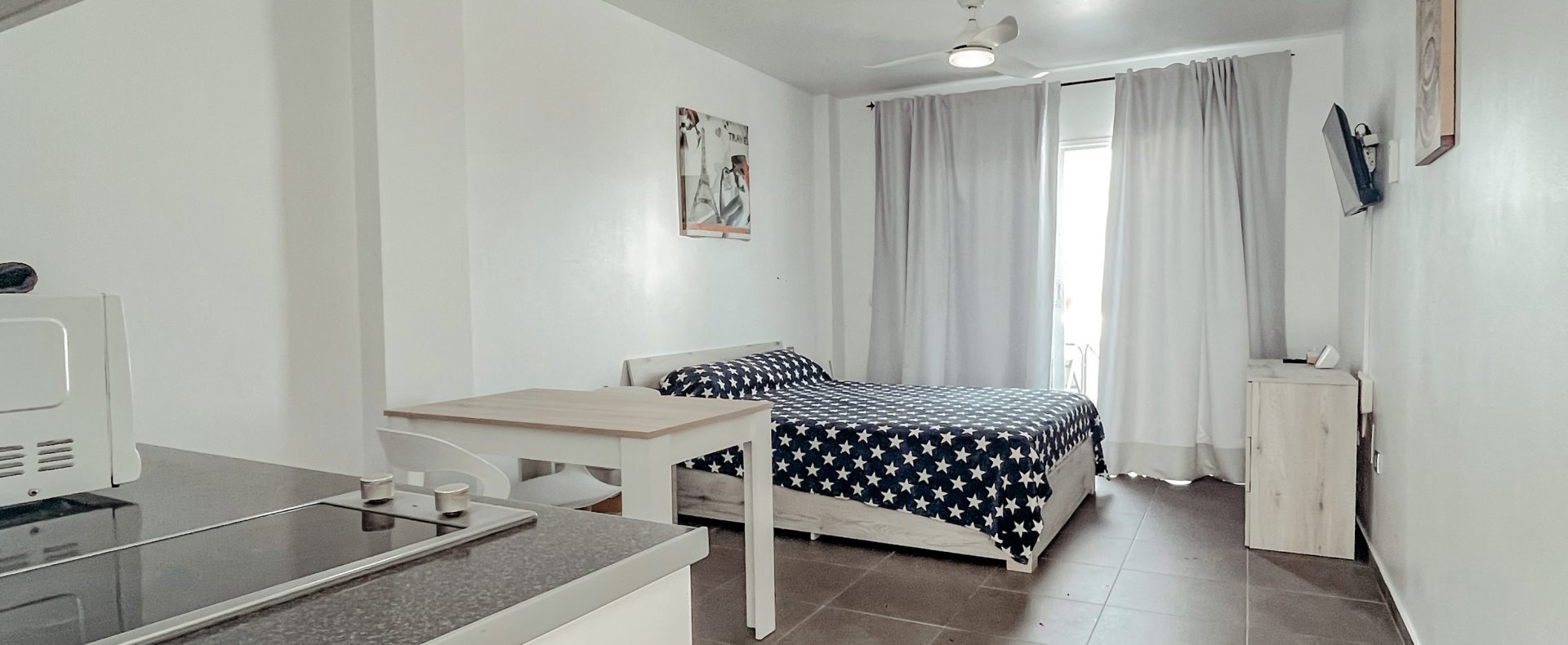 Studio is located in very middle of Las Americas, next to small park to have some peace and quiet in the same time. The beach – Playa El Bobo – is just across the street. There is a great choice of bars, clubs and restaurants in the area. All amenities and shops can be reached on feet. Also tourist loved Puerto Colon, with all the sea excursions that might be offered, is just 15 min walking distance away.