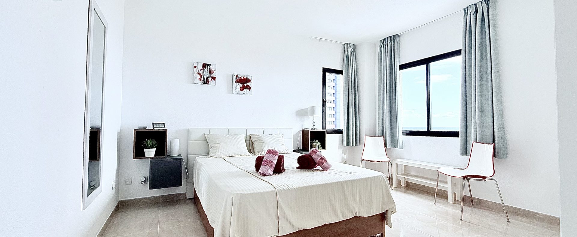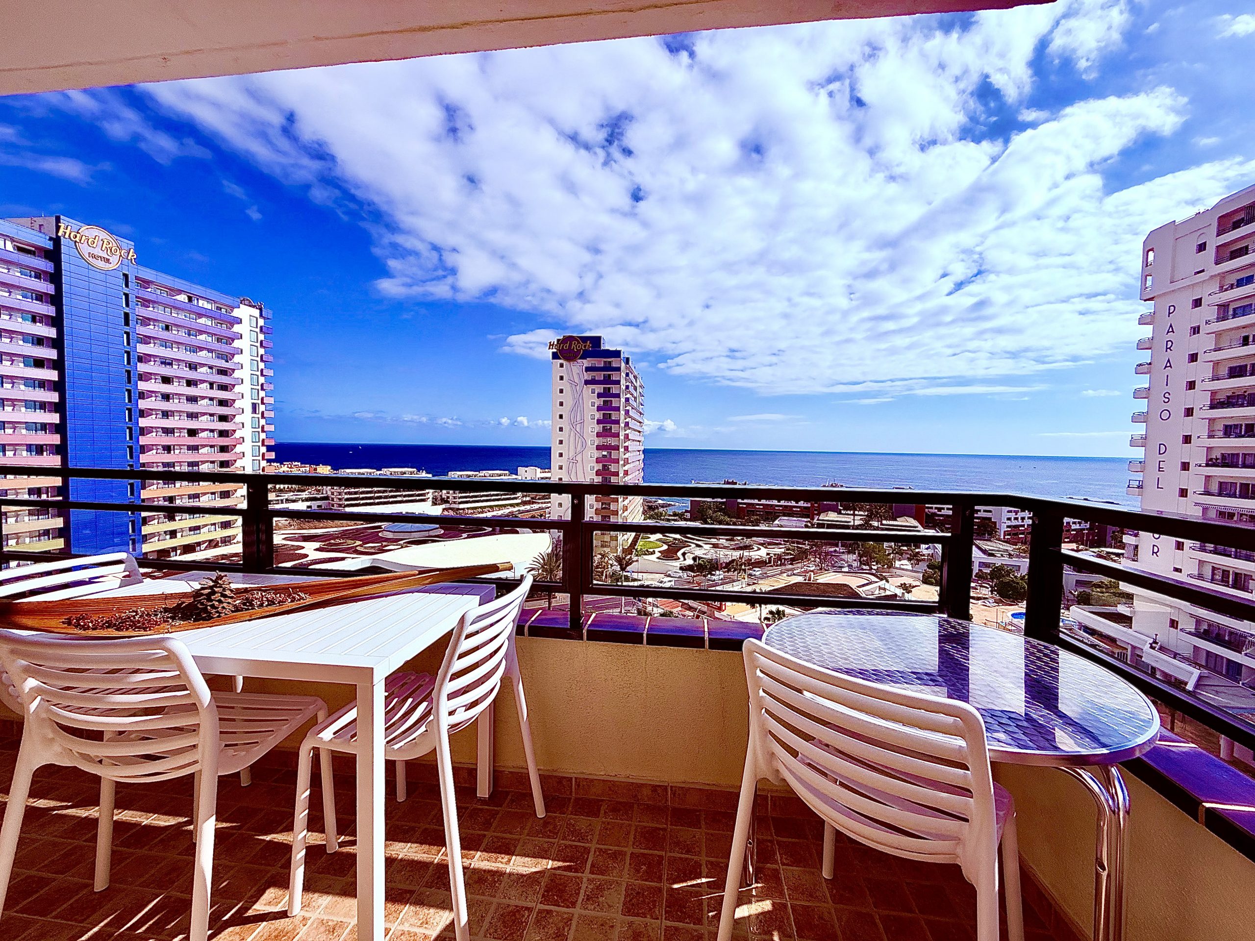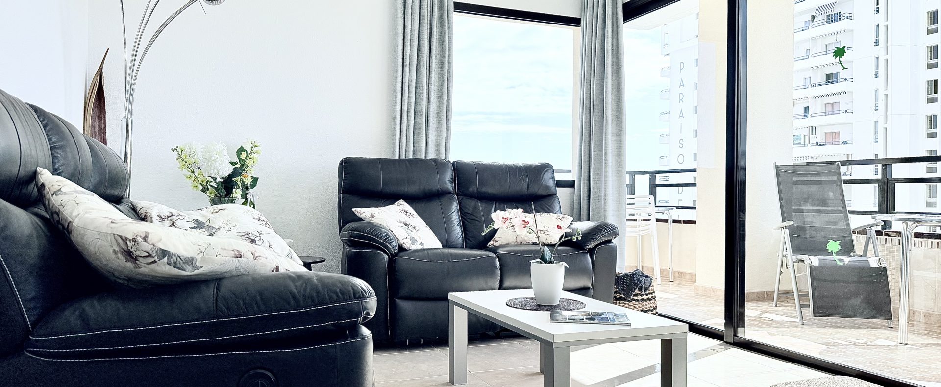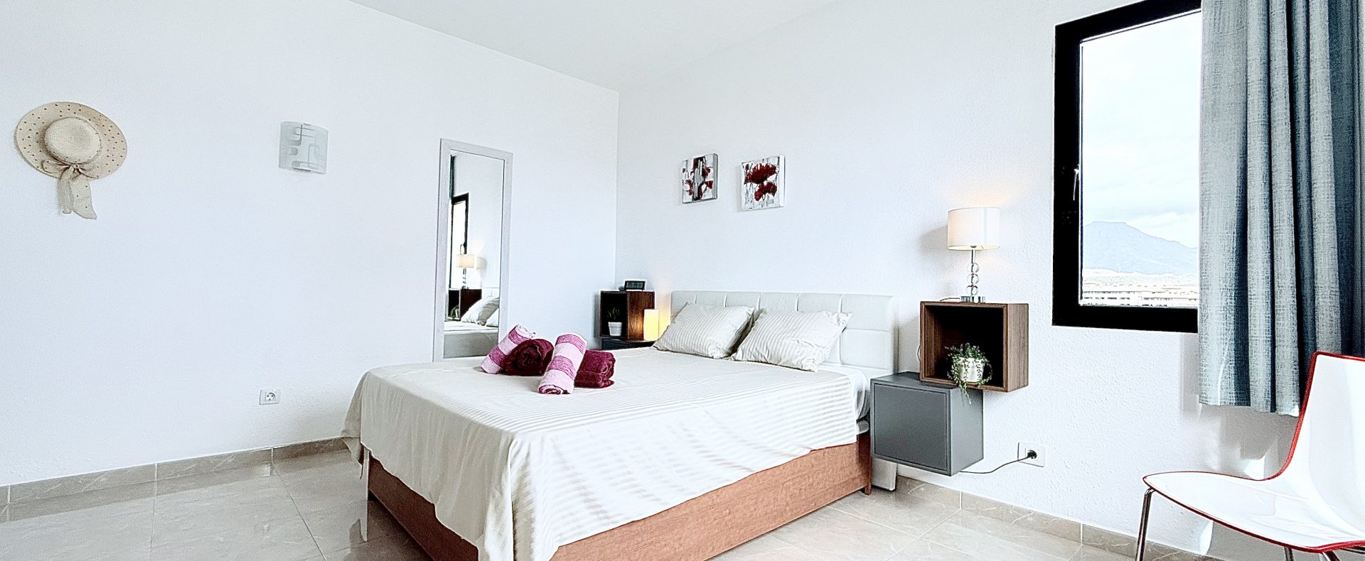 Vista Mar is a spacious and bright apartment located in the Club Paraíso, in the charming coastal town of Playa Paraíso, on the sunny south coast of Tenerife. It features 2 generous bedrooms, 2 bathrooms, a sunlit living room with a full kitchen, and panoramic windows leading to a private balcony where you can enjoy breathtaking sunsets over La Gomera. This great apartment for friends or family to share offers a large shared pool and stunning ocean views—ideal for a relaxing island getaway.
